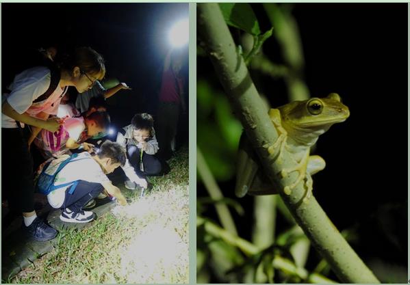 树下是各类蛙喜欢的地方,穿着花夹克的花狭口蛙是今晚的主角,在好几棵树下都看到或沉思或发呆的它,这个喜欢学老牛叫的家伙,也许在等一场雨吧。褐云玛瑙螺可以说是每一场夜观的常客了,被列为十大入侵物种的它,自有其强悍的生存之道,不管人类喜欢与否,它就那样安安静静地我行我素,在人类的围追堵截下不断繁衍。大眼萌树蛙是每一次夜观的明星,顾名思义,它是喜欢在树上生活的蛙,它连孩子都要产在树上,可见它有多喜欢树上啊!看它的脚,你发现它爬树的秘密了吗?它还会飞檐走壁呢!
