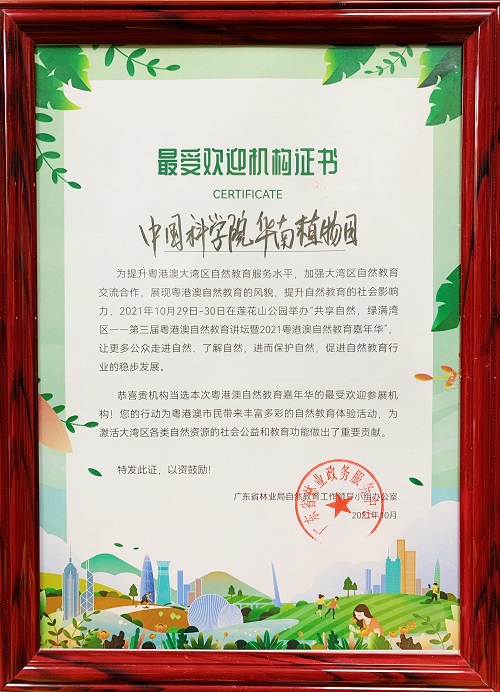 华南植物园获得第三届粤港澳自然嘉年华“最受欢迎机构”
