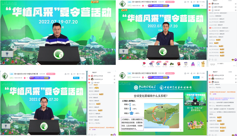 植物中心的陈红峰研究员、董仕勇副研究员、生态中心的刘占锋研究员、侯恩庆研究员、农生中心的杨宝研究员、曾兰亭研究员等导师代表就各自研究方向及成果与营员们进行了交流。内容涵盖岭南园林植物特色及资源开发利用、浅谈什么是植物分类学、全球变化下陆地碳循环与磷供给、土壤中的朋友圈“神秘而美丽的土壤生物”、功能食品创新研究、逆境中的茶味和茶香等多个学科方向。正值华南国家植物园成立之际,文香英高级工程师讲述了世界植物园和我国国家植物园的基本概况。科学家们用浅显易懂的话语,诠释了深奥的科学原理、展示了最新的科研进展。激发了营员们的科研兴趣,引发了他们探索科研奥秘的好奇心。营员们通过弹幕聊天的方式参与互动,与老师们展开了热烈的探讨。