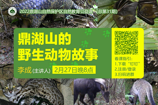 3月8日,我们迎来了2023开年来的第一课,即鼎湖山保护区第31期线上自然教育公益讲座。讲座由西子江生态保育中心李成老师主讲,他给大家呈现了一堂以《鼎湖山的野生动物故事》为题的直播讲座。李老师从鼎湖山的区位出发,为大家详细介绍了鼎湖山的森林植被类型及独具鼎湖山特色的奇趣动物,并结合具体例子,如版纳鱼螈、果蝠、豪猪、野猪及小灵猫等,详细介绍了这些生物的生活习性,李老师生动有趣的语言在让大家啧啧称奇的同时,也收获了丰富多样的动物知识。