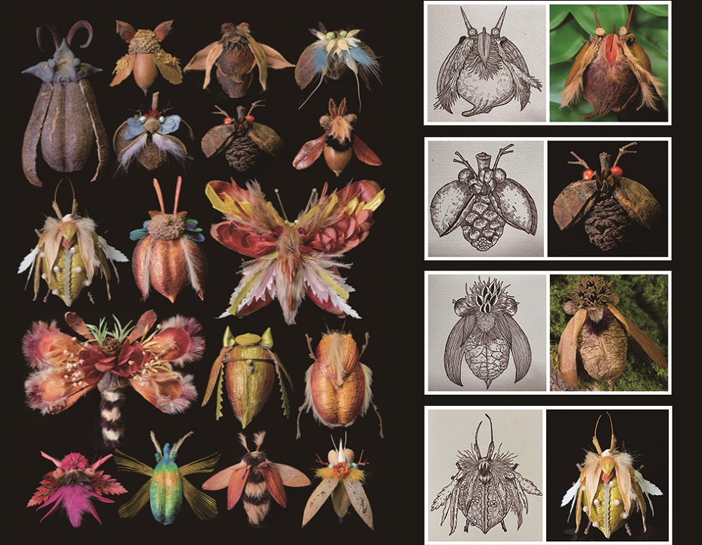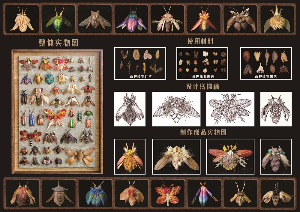 华南植物园选送的荣获大赛三等奖作品“涅槃群生--植物昆虫系列手作”,创作灵感源自于大自然的恩赐,其中所用的200多种花、果、叶、种子等材料无一不是撷取于自然界,通过精心设计、艺术融合和巧妙制作,最终以栩栩如生的昆虫形态展示出来。作品不仅将枯与荣、动与静的植物完美整合,赋予枯枝残叶新的生命,而且在保持自然物原本状态的同时,又具有崭新的元素和质量的升华,化腐朽为神奇,给观者展现出耳目一新全景式的自然界。该作品设计制作者表示,大自然中赋存着无以数计美妙绝伦的物质和远胜人类施教的影响力量,无疑是一切艺术创造的泉源。将创作灵感与自然物质的巧妙结合,就在于着意塑造全新美感,引导人们遵从自然、受惠自然、领悟自然,并与自然和谐相处。
