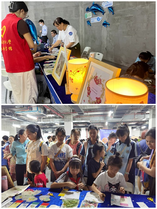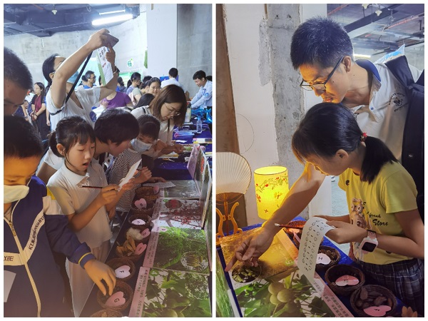 主会场活动科普嘉年华现场,共设150个展位向市民多角度展示广州地区的科普资源、科技成果和科研能力,为市民提供了互动、参与、分享、体验的科普盛宴。华南植物园科普工作者柯萧霞、朱韵贤在主会场展位开设科普互动课堂,向公众传授押花艺术创作技巧、认识植物和了解其种子形态等。