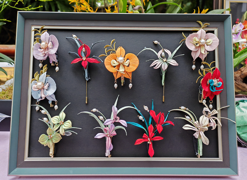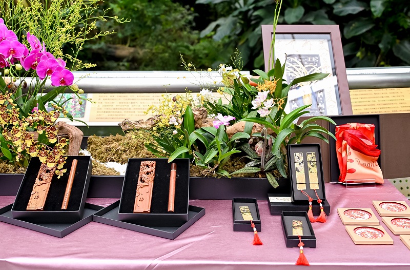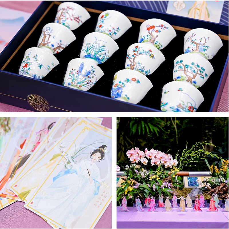 兰花系列文创 以华南国家植物园研究团队所选育的兰花新品种:麒麟火焰兰、中科COP15兜兰、“南植之星”兜兰和铁骨素心兰为设计元素,设计了檀香香盒、桑蚕丝丝巾、植物扎染手拎包、衍纸摆件、胸针、陶瓷杯垫、笔记本、书签、红包等文创产品。其中麒麟火焰兰文创如火焰的形状,鲜艳的橙红花色与密集的红色斑点,更是为寒冷的冬季带来热情和力量,寓意着新年的生机与活力。