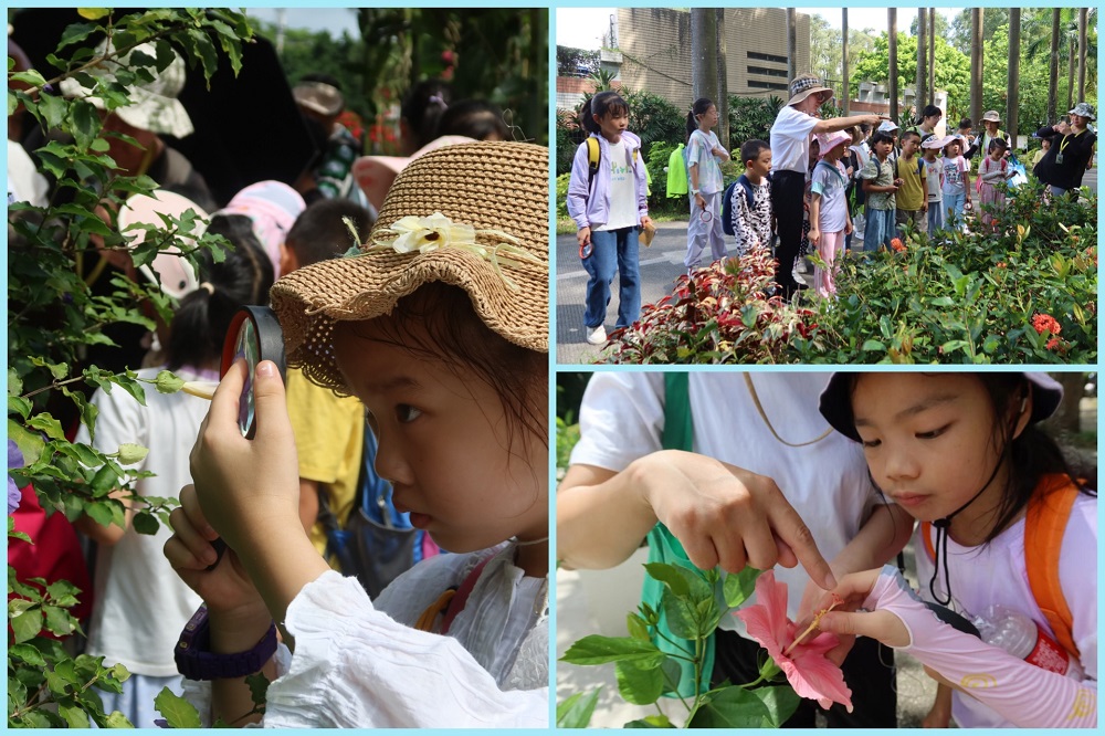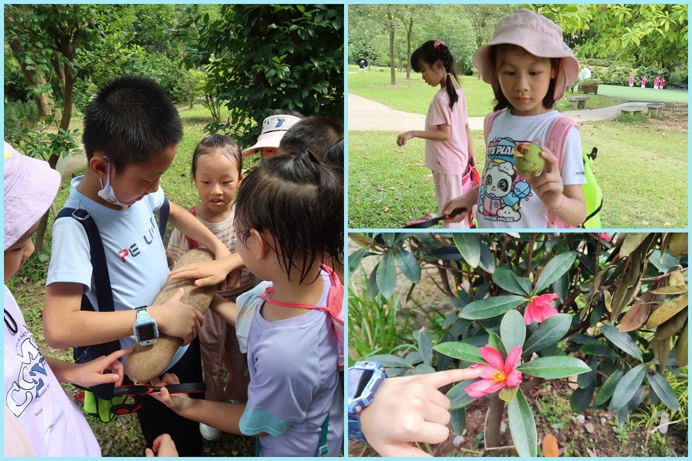 孩子们拿着放大镜,不停地寻找大自然里的秘密。花丛中,蜜蜂和蝴蝶飞来飞去,在一朵花的花蕊上停留片刻又飞到其它花的花蕊上,科普老师向孩子们讲述了花与昆虫的故事。在植物的世界里,有花植物在长期进化中与传粉动物“签下了契约”,昆虫为花朵传粉同时也得到花蜜或是花粉作为食物。只有完成传粉,植物的花才能发育为果实。老师联系生活实际“今年荔枝又少又贵”等,讲解植物传粉对我们人类的影响,分享保护生态系统的重要性。