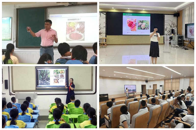 华南国家植物园曾少华研究员走进天河区东圃小学,给孩子们带来《五彩缤纷的植物世界》科普讲座,讲解植物色素的基本概念和类型,展示常见果蔬中的色素组成,穿插花青素提取的小实验,以多种多样的形式揭示植物“五彩缤纷、绚丽多彩”的奥秘。
