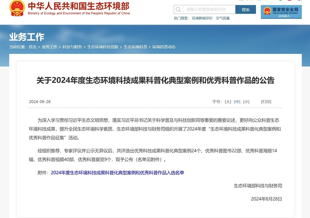 为深入学习贯彻习近平生态文明思想,落实习近平总书记关于科学普及与科技创新同等重要的重要论述,更好向公众科普生态环境科技成果,提升全民生态环境科学素质,生态环境部科技与财务司组织开展了2024年度“生态环境科技成果科普化典型案例和优秀科普作品征集”活动。
