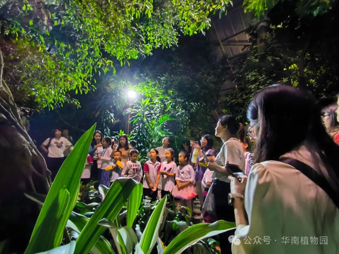 从天空俯瞰,夜幕下的温室群景区,犹如绿色城堡,美如童话。在科普老师的带领下,人们欣赏琳琅满目的植物,它们或源于高山之巅、沙漠之腹,或来自雨林之丛,植物多样性之美,深深的吸引着大家。夜晚的温室群景区,人们少有机会见到,植物有哪些不一样的状态,激起了大家的好奇心,尤其是孩子们。王莲的花儿红了脸庞、玉蕊花丝闪耀、叉叶木花蜜欲滴、合欢闭着叶子睡觉,晚上有不一样的精彩。大家一边拍照一边观察一边思考,植物为什么要夜间开花?植物园的园徽琼棕有什么故事?国家保护植物怎么会在绿化带?大家七嘴八舌的讨论着,科学的种子在人们的心中播下,大家纷纷表示这是一个愉快而有意义的夜晚。