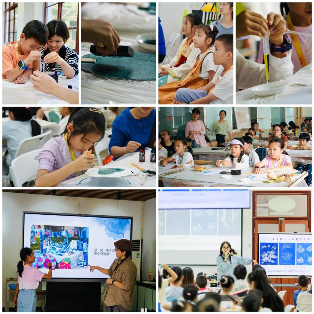 老师先从蓝染与蓝晒作品的区别引入大家认识什么是蓝晒。蓝晒,又称铁氰酸盐印相法。它是一种独特古老的摄影工艺,是通过柠檬酸铁和铁氰化钾混合制成的感光液,利用阳光或紫外线照射后,形成特有的蓝色调照片的传统摄影技术。它具有感光性强、成相清晰、易于长久保存等特点。接着介绍蓝晒所需的材料:两种蓝晒溶液、毛刷、调液盘、承印物(纸、本、木材等);蓝晒的工艺流程:调和感光液、涂抹感光液、阴干画纸、摆放图案、阳光下曝光、洗相、晾干。了解了基本原理后,大家就动手实操。当完成了流程前面两个步骤,等待画纸阴干的时间,老师又带领学员们走到园里,收集创作需要的植物花、果、叶,同时与植物进行奇妙的对话,领略植物的魅力与神奇。
