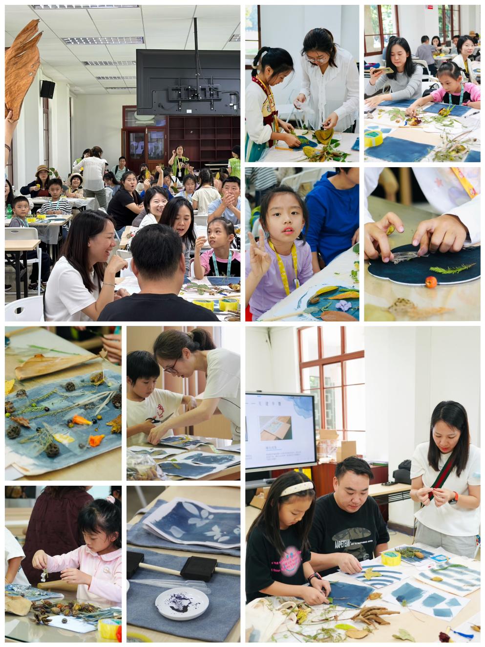 带着满满的收获回到课室里,涂了蓝晒感光液的画纸、画扇、画布袋也已经阴干。学员们把带回来的各种植物宝贝,挥洒神奇植物开启的灵感,在蓝晒纸上创作自己喜欢的图案,并用透明胶带轻轻固定。然后把作品摆放到课室外草坪上晒太阳,让阳光发挥神奇的魔力,来完成作品的呈现。在这等待的过程中,我们继续了解蓝晒的历史。原来这项技术是两百多年前英国天文学家约翰·赫歇尔发明的,后来被广泛运用到建筑和工程图纸的制作。1843年英国植物学家安娜·阿特金斯利用蓝晒印相工艺制作了一系列的植物照片专辑,完美的呈现了藻类植物、蕨类植物标本。蓝晒与植物就这么奇妙的产生了对话,跨越了时空,为植物定格了美丽的光影。当然,蓝晒发展到今天,经过艺术家们的不断探索,蓝晒还可以作为一种新的视觉媒介,创作出更多独特的艺术价值。