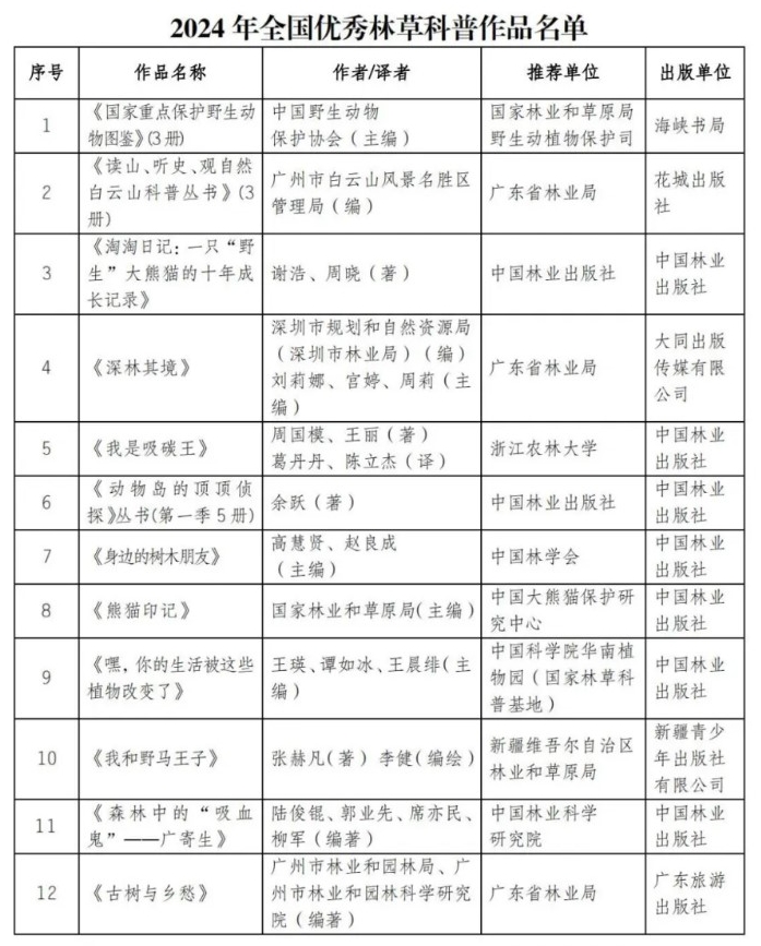 近日,国家林业和草原局科技司公布第二届全国林草科学实验展演汇演活动、2024年全国优秀林草科普作品评选以及2024年全国优秀林草科普微视频作品大赛3项林草科普赛事结果,经过形式审查、通讯评审、会议评审和社会公示等环节,31部作品入选2024年全国优秀林草科普作品,40部作品入选2024年全国优秀林草科普微视频作品,其中由王瑛、谭如冰、王晨绯主编的《嘿,你的生活被这些植物改变了》入选全国优秀林草科普作品,由苏嘉艺、王彤创作“善变的女神——王莲”入选全国优秀林草科普微视频作品。