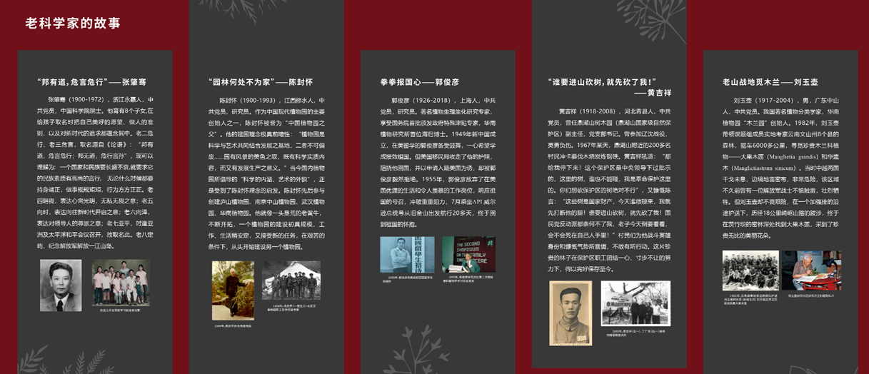 设计理念依据华南植物园近百年的规划建设和发展,离不开党的支持和老一辈科学家们的辛勤奉献。华南植物园早期的园貌以及不少园中园都是当年在曾担任中国广东省委书记陶铸同志的支持和指示下建成的。陈焕镛、张肇骞、陈封怀等老一辈科学家为华南植物园学科发展、平台建设等立下不朽功勋,铸就了华南植物园独特的精神气质,形成了“情系草木、躬身大地”的老一辈科学家精神,润育了“根植华南·家国天下”的新时代科学家精神。科学家精神成为华南植物园弥足珍贵的宝贵精神财富,滋养和激励后人奋发前进。
