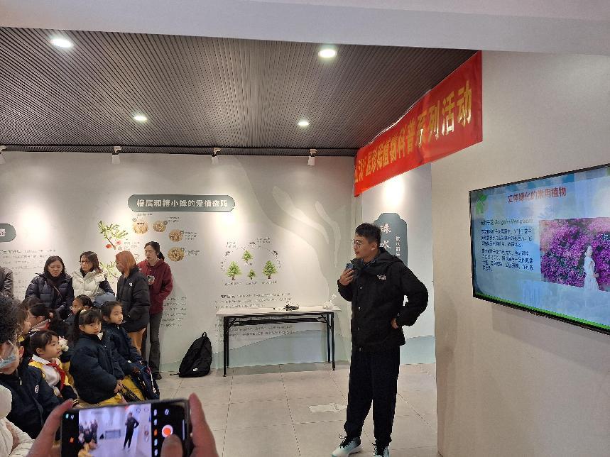 活动分科普知识讲堂、植物压花DIY及户外植物认知三个模块,为青少年带来了充满乐趣又涨知识的科普实践体验。在科普讲堂上,中国科学院华南植物园研究生郭永甲与孩子们探讨了“未来城市的绿色——立体绿化”在改善城市人居环境方面的重要作用和实际应用,让青少年对立体绿化有了更多的认识和了解。在标本制作和压花DIY环节,刘海林博士带孩子们用放大镜领略蕨类植物独特的繁殖方式,实操演示植物压花制作技巧,激发了孩子们的“自然艺术灵感”,体会创造的乐趣,感受植物压花艺术的魅力。在湖心岛植物引种区,中国科学院华南植物园邓双文博士不仅向师生及家长们生动讲述了每一种珍稀濒危重点保护植物的独特故事,还介绍了公园内丰富多彩的观赏和食药用植物,让大家更深刻理解了植物与我们日常生活和健康的紧密联系,提高了大家的生态保护意识。