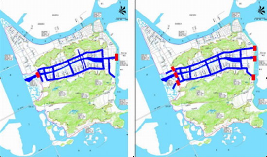 对原有规划(左)的水系进行改造(右)的方案(红色部分为水闸)