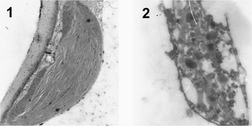 亚硫酸氢根对马尾松叶绿体结构的破坏情况(1,对照;2,亚硫酸氢根处理)