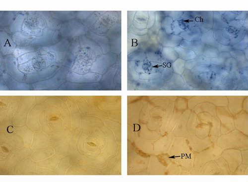 另外,在对林下多年生草本植物海芋(Alocasia macrorriza)的研究发现,随着铅离子和镉离子处理浓度的升高,海芋叶片细胞内活性氧大量形成,细胞死亡率升高。通过显微镜观察经铅离子和镉离子处理后出现的活性氧特异染色部位,发现超氧自由基的产生位点主要是表皮细胞的质膜和气孔保卫细胞的叶绿体,而过氧化氢则主要定位于表皮细胞的质膜上。在高浓度的铅离子作用下,海芋光系统II的光化学效率降幅比在镉离子作用下小,且非光化学荧光耗散持续增大。这表明与镉离子相比,铅离子对叶片细胞活性和光系统II功能的伤害更小。研究推测海芋具有抵御铅胁迫的能力和潜在的铅富集能力。