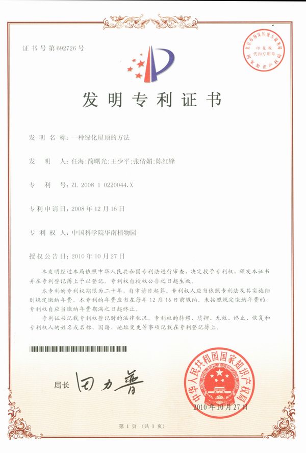 由华南植物园任海研究员等完成的“一种绿化屋顶的方法”于近日获得国家发明专利授权(专利号:ZL 200810220044.X)。