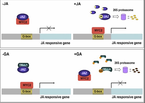 赤霉素(GA)调控茉莉酸甲酯(JA)的信号转导途径,而JA信号途径在植物发育和胁迫诱导中起着非常重要的作用。JA作为植物发育中重要的信号途径一直是研究热点。然而,植物各种信号途径之间的调控网络复杂,大部分植物激素之间的相互作用仍然不清楚。