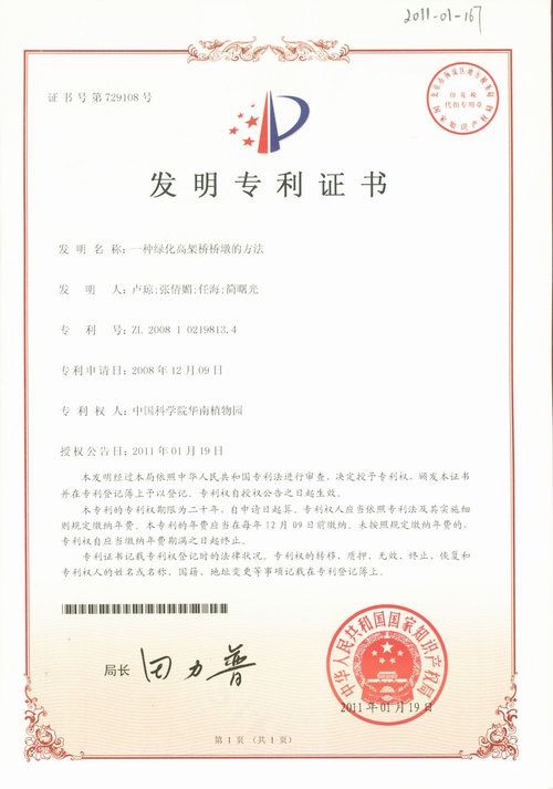 2月18日收悉,由华南植物园张倩媚、任海等科研人员完成的“一种绿化高架桥桥墩的方法”获得国家发明专利授权(专利号:ZL 200810219813.4)。