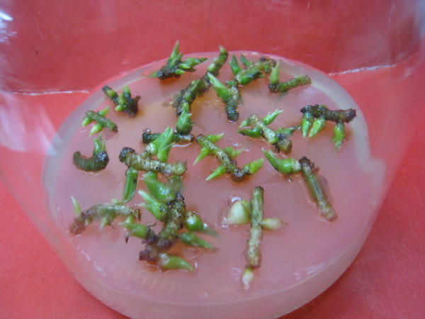 珍珠矮(Cymbidium nanutum Y.S.Wu et S.C.Chen)是中国特有的地生兰,仅分布于海南东南部、贵州西南部和云南西南部。其叶片直立、花淡黄绿色或紫色,有香味,观赏价值高。由于其生存环境的破坏和对野生资源的过度采挖,珍珠矮的种质资源已濒临灭绝,扩大其种群数量并进行自然回归十分迫切。珍珠矮的常规繁殖主要靠分株,繁殖速度慢;而且和其它兰花一样,其种子发育不完全,在自然状态下需与真菌共生才能萌发,成苗率极低。因此,采用无菌播种和组织培养技术是扩大其种群数量的最有效方法。