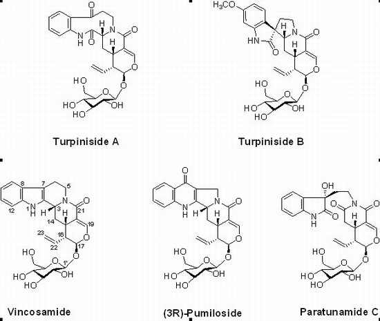 为阐明山香圆的生物活性物质,华南植物园植物化学实验室魏孝义研究员以及博士生吴敏等科研人员近期从山香圆中首次获得了5个单萜吲哚生物碱类成分,其中2个为新化合物,命名为两指剑苷A(turpiniside A)和两指剑苷B(turpiniside B)。研究还发现,5个单萜吲哚生物碱类化合物具有不同强度的DNA裂解活性,其中新化合物两指剑苷A的活性最强,并且这些化合物的DNA裂解活性与其结构具有相关性。