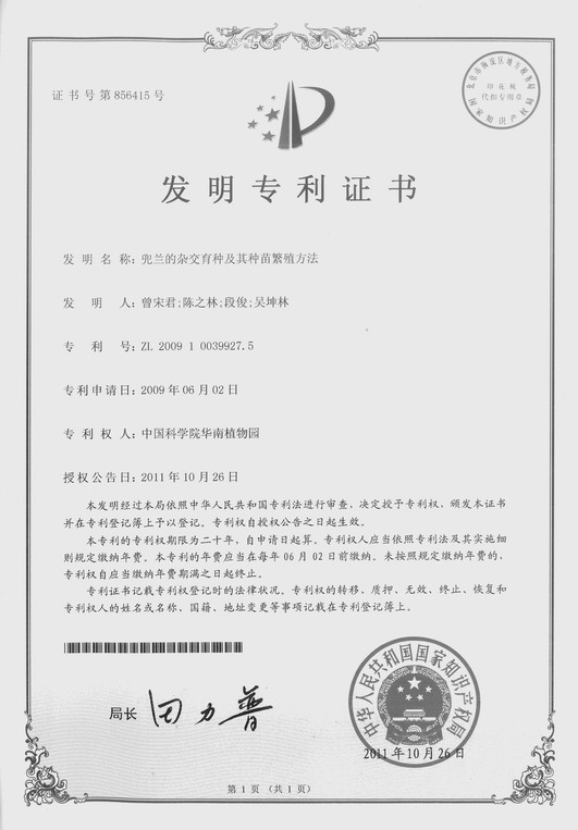 由华南植物园曾宋君、段俊等科研人员完成的“兜兰的杂交育种及其种苗繁殖方法”于近日获得国家发明专利授权(专利号:ZL 200910039927.5)。