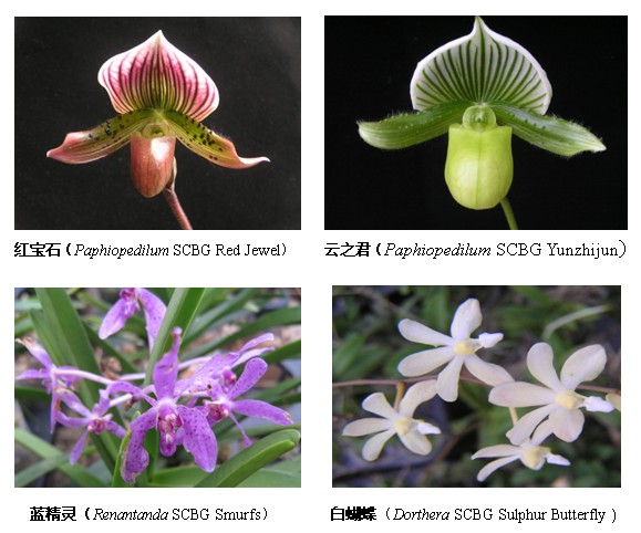 在国家科技支撑计划项目“兰科植物的快繁体系和综合栽培技术研究和示范”(编号:2008BAC39B05)和广东省产学研项目“兜兰产业化技术研究和中试推广”(编号:2011B090300007)等项目的资助下,由华南植物园农业植物遗传育种重点实验室曾宋君、吴坤林、张建霞和段俊等科研人员培育出的四个兰花新品种红宝石(Paphiopedilum SCBG Red Jewel)、云之君(Paphiopedilum SCBG Yunzhijun)、蓝精灵(Renantanda SCBG Smurfs)和白蝴蝶(Dorthera SCBG Sulphur Butterfly)。于近日在英国皇家园艺协会(Royal Horticultural Society)成功登录,其中蓝精灵[由中华火焰兰(Renanthera sinica)和小花万带兰(Vanda coerulescens)杂交而来]、白蝴蝶[由菲律宾火焰兰(Renanthera philippinensis)和五唇兰(Doritis pulcherrima)杂交而来]为属间杂交种。