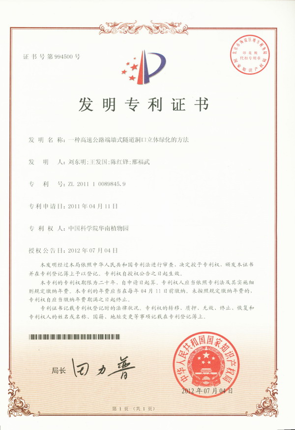 7月22日收悉,由华南植物园刘东明等科研人员完成的“一种高速公路端墙式隧道洞口立体绿化的方法”获得国家发明专利授权(专利号:ZL201110089845.9)。