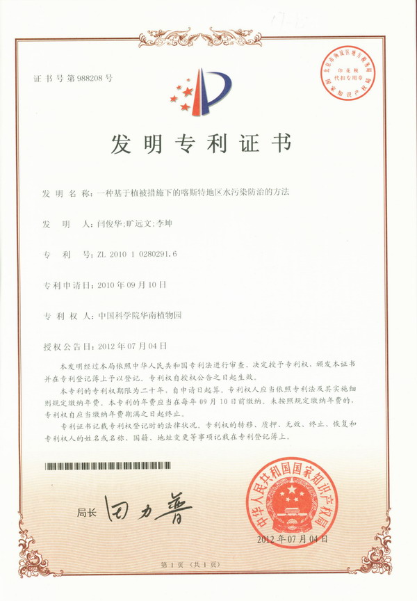 7月25日收悉,由华南植物园闫俊华等科研人员完成的“一种基于植被措施下的喀斯特地区水污染防治的方法”获得国家发明专利授权(专利号:ZL 201010280291.6)。