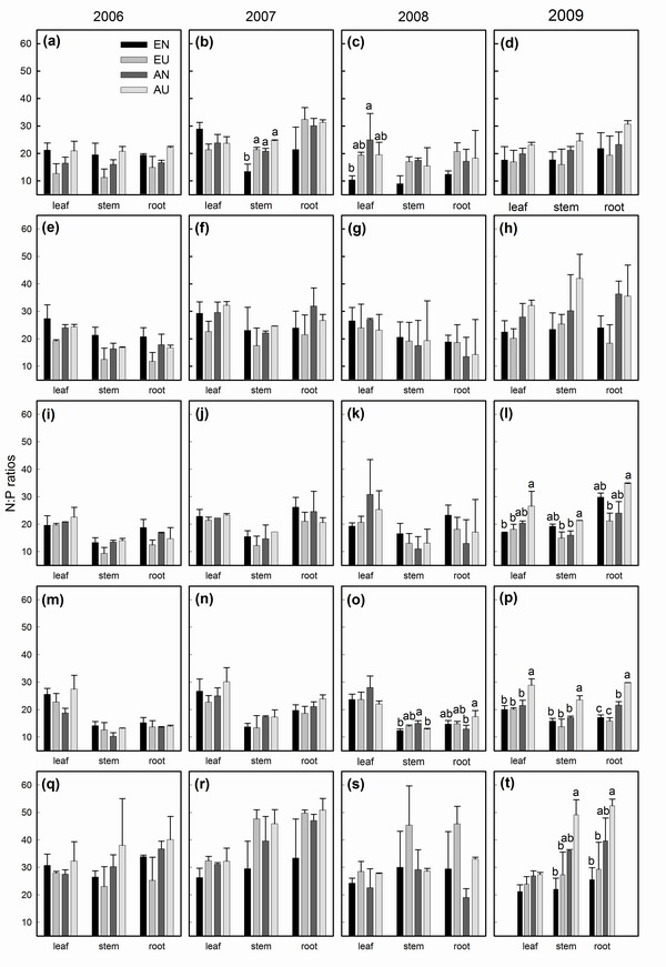图示:大气CO2浓度上升和N沉降加大对5种乡土树种植物体内N和P比例的影响。A-d:肖蒲桃,e-h:红锥,i-l:红鳞蒲桃,m-p:荷木,q-t:海南红豆。EN:高CO2浓度和高N处理,EU:高CO2浓度和不加N处理,AN:背景CO2和高N处理,AU:背景CO2浓度和不加N处理。