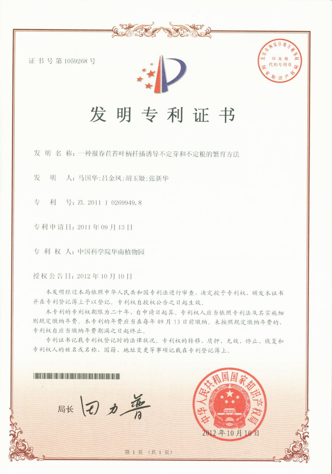 10月23日收悉,由华南植物园马国华研究员等完成的“一种报春苣苔叶柄扦插诱导不定芽和不定根的繁育方法”获得国家发明专利授权(专利号:ZL 201110269949.8)。