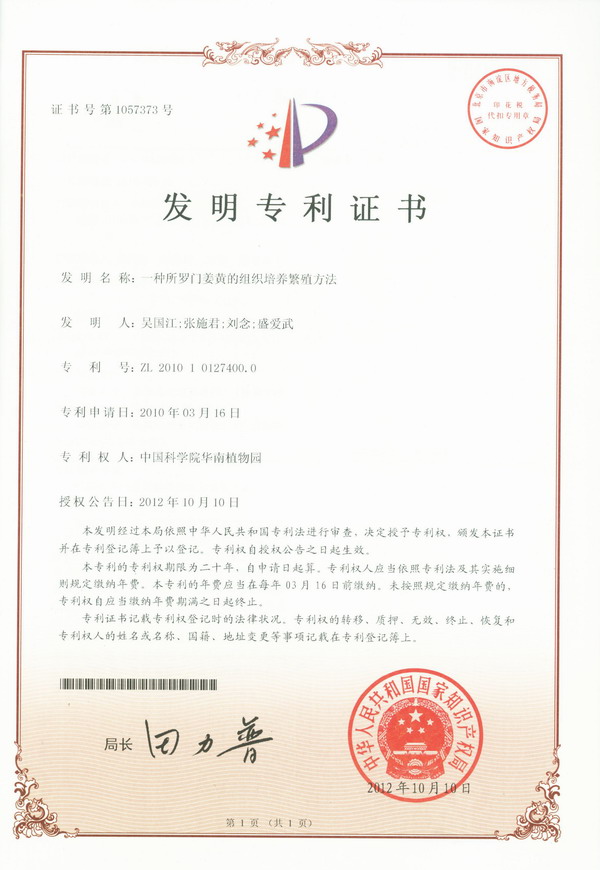 10月25日收悉,由华南植物园吴国江研究员等科研人员完成的“一种所罗门姜黄的组织培养繁殖方法”获得国家发明专利授权(专利号:ZL 201010127400.0)。