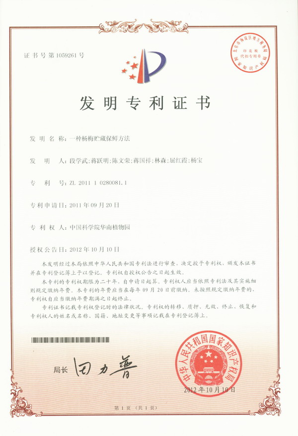 10月29日收悉,由华南植物园段学武、蒋跃明等科研人员完成的“一种杨梅贮藏保鲜方法”获得国家发明专利授权(专利号:ZL201110280081.1)。