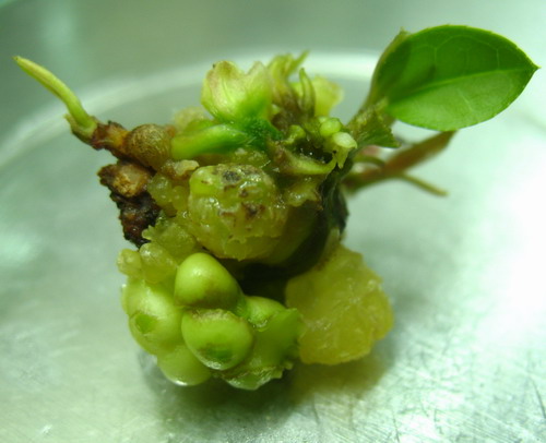 华南植物园生物技术育种组的硕士研究生吕金凤等同学在导师马国华研究员指导下,以金花茶未成熟合子胚萌发的子叶作为外植体,成功诱导胚性愈伤组织,建立金花茶离体组织繁殖再生体系。实验结果显示,未成熟合子胚萌发的子叶脱分化形成的黄色胚性愈伤在添加不同植物生长调节剂的改良WPM培养基上通过芽器官发生和体细胞胚发生这两种途径获得再生植株,同时形成新形体结构。新形体具有子叶的分化功能,在其表面分化形成不定芽和体细胞胚这两种途径获得再生苗,同时又分化形成新的新形体结构,进入下一轮的增殖和分化再生。细胞分裂素类型(BA、Kn、Zn)对三种再生结构组织的影响具有显著差异。BA利于诱导芽器官发生,诱导体细胞胚最好的是Zn。Kn偏向诱导形成新形体。金花茶再生芽经过伸长、壮苗和生根诱导,形成了完整的植株。