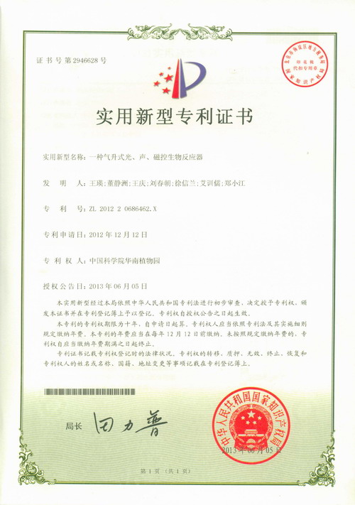 96收悉,由华南植物园王瑛研究员等科研人员完成的一种气升式光、声、磁控生物反应器获得国家实用新型专利授权(专利号:ZL 201220686462.X)。