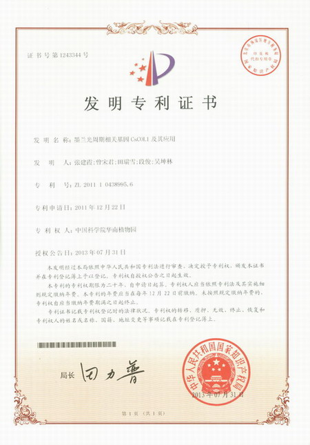 9月9日收悉,由华南植物园张建霞等科研人员完成的“墨兰光周期相关基因CsCOL1及其应用”获得国家发明专利授权(专利号:ZL 201110438995.6)。