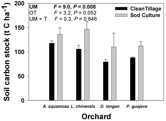 农林生态系统在全球碳循环过程中发挥着非常重要作用,它的碳储量占陆地生态系统碳储量的12%。作为一种人工管理的生态系统,林下植被管理是被广泛采用的管理措施之一。诸多研究表明林下植被的管理可以显著影响土壤肥力、树木营养和水果质量。但是我们对农林生态系统中林下植被管理如何影响土壤碳固持却了解很少。
