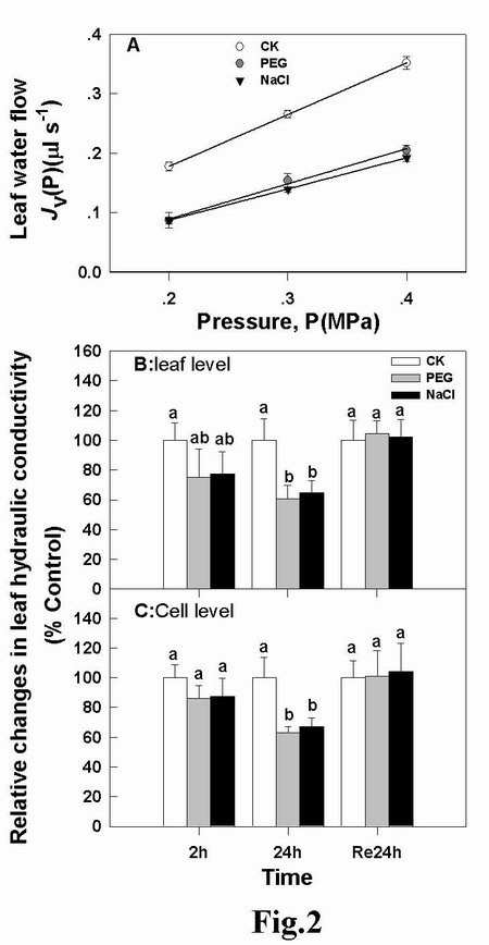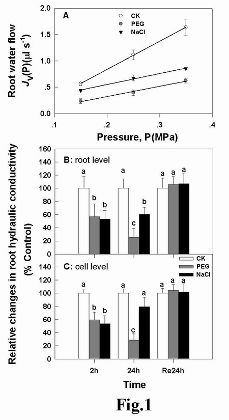 图1. 盐胁迫和PEG胁迫下,根系及根细胞水分传导效率相对变化