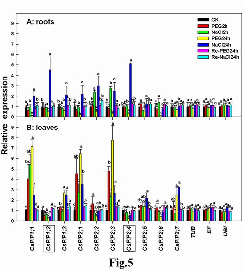 图3. 盐胁迫和PEG胁迫下,水孔蛋白基因在黄瓜叶片及根系的相对表达量