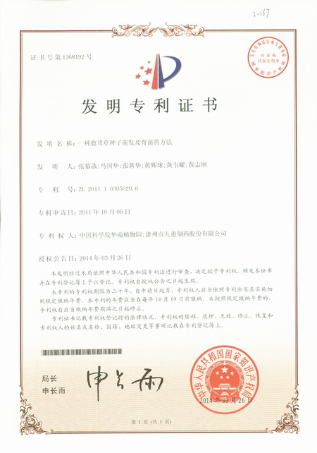 4月24日收悉,由华南植物园马国华研究员等科研人员完成的“一种鹿茸草种子萌发及育苗的方法”获得国家发明专利授权(专利号:ZL201110305020.6)。