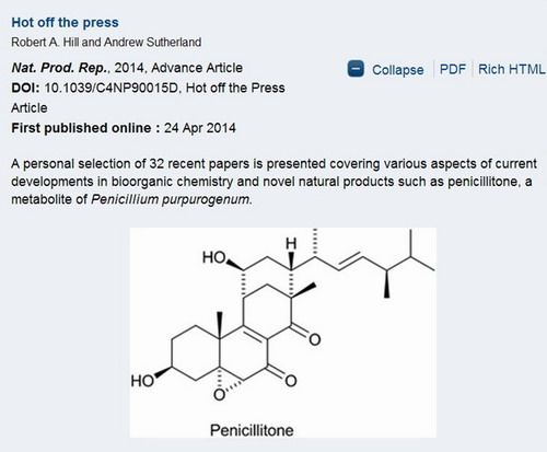 中科院华南植物园植物化学资源生物学研究组魏孝义研究员等发表在Organic Letters (2014,16, 1518–1521)上的新骨架甾体化合物penicillitone被Natural Product Reports (NPR, DOI: 10.1039/C4NP90015D)评选为热点化合物,并被作为图文摘要出现在该刊目录中。NPR由英国皇家化学会主办,是天然产物化学领域顶级学术期刊。其Hot off the Press(热点化合物)是该刊的品牌栏目,精选新近报道的重要天然产物进行扼要述评,以期引起研究人员的关注。入选热点化合物已成为显示该领域科研人员、研究机构学术影响力的重要标志之一。