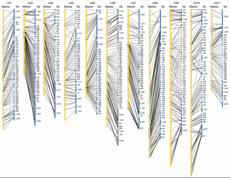 华南植物园吴国江研究员团队联合国内多家单位完成了麻疯树全基因组测序和组装,组装基因组大小为320.5 Mbp,在基因组中共发现了27,172个蛋白编码基因。另外研究人员构建了以麻疯树为母本,同属植物日日樱(J. integerrima)为父本的BC1群体,构建了由1,208个分子标记组成的高密度遗传图谱,并将81.7%的基因组序列锚定到11条染色体上(见附图)。麻疯树和蓖麻基因组在物种进化中有多个基因家族进行了特异扩增和收缩,包括油脂合成途径基因和核糖体失活蛋白(RIP)基因等。此基因组序列和遗传图谱为麻疯树基础研究和分子育种提供了重要信息。