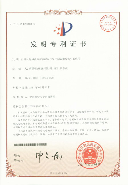 3月27日获悉,由华南植物园蒋跃明、段学武等科研人员完成的“泡盛曲霉在发酵荔枝果皮制备槲皮素中的应用”获得国家发明专利授权(专利号:ZL201310060543.8)。