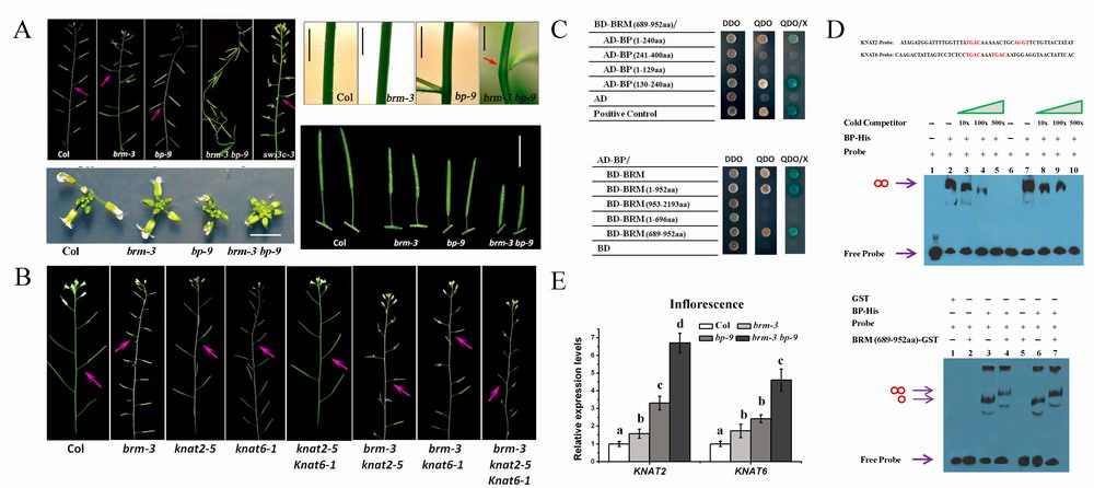 中科院华南植物园刘勋成博士指导研究生赵明磊在模式植物拟南芥花序结构发育的转录调控机制中取得重要研究进展。观察发现,与野生型的拟南芥植物相比,染色质重塑因子BRAMHA(BRM)与BP的缺失突变体的表型相似,均呈现出相对下垂的角果、短小的果柄和紧密的花序等表型,而BRM和BP的双突变体呈现更为显著的发育缺陷,揭示BRM和BP可能位于同一信号途径中调控花序结构的发育过程(图A)。遗传学分析显示,在BRM的突变体中同时敲除KNAT2和KNAT6两个基因后,植物可恢复到正常的花序形态,表明BRM在遗传关系上位于KNAT2和KNAT6基因的上游(图B)。同时,体内和体外的分子生物学研究显示,BRM与BP在植物体内通过蛋白相互作用形成复合体(图C),共同结合于下游基因KNAT2和KNAT6位点上(图D),并通过降低组蛋白甲基化(H3K4me3)的水平,改变染色质的状态,从而抑制其表达(图E)。