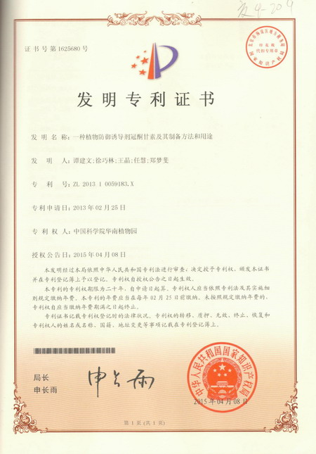 4月29日获悉,由华南植物园谭建文研究员等科研人员完成的“一种植物防御诱导剂冠酮甘素及其制备方法和用途”获得国家发明专利授权(专利号:ZL201310059183.X)。