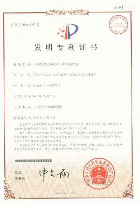 5月19日获悉,由中科院华南植物园李志安研究员等科研人员完成的“一种降低牧草和蔬菜中镉含量的方法”获得国家发明专利授权(专利号:ZL201310185777.5)。