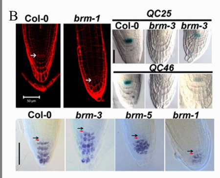 Figure B.BRM 突变导致拟南芥主根干细胞微环境发育异常。