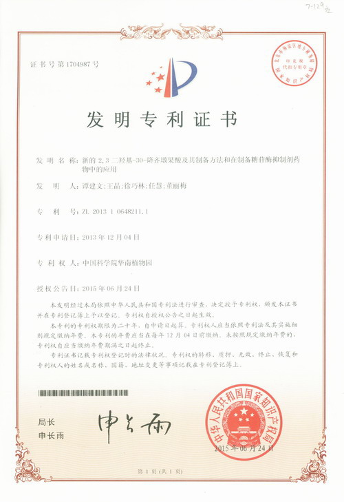 7月22日获悉,由中科院华南植物园谭建文研究员等科研人员完成的“新的2,3二羟基-30-降齐墩果酸及其制备方法和在制备糖苷酶抑制剂药物中的应用”获得国家发明专利授权(专利号:ZL 201310648211.1)。