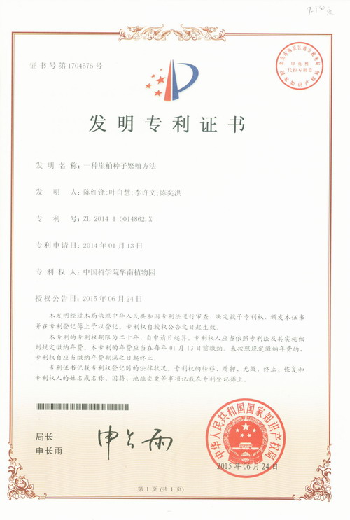 7月23日获悉,由中科院华南植物园陈红锋研究员等科研人员完成的“一种崖柏种子繁殖方法”获得国家发明专利授权(专利号:ZL 201410014862.X)。
