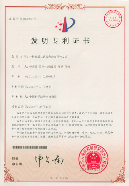 10月27日获悉,由中科院华南植物园曾宋君研究员等科研人员完成的“一种石斛兰试管内杂交育种方法”获得国家发明专利授权(专利号:ZL 201310285055.7)。
