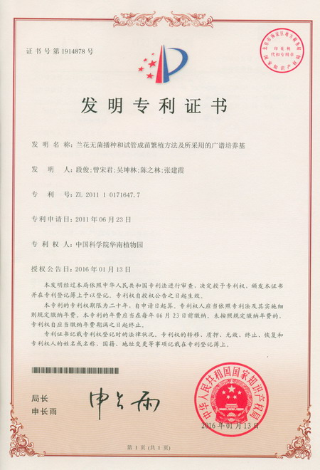 2月2日获悉,由中科院华南植物园段俊、曾宋君等科研人员完成的“兰花无菌播种和试管成苗繁殖方法及所采用的广谱培养基”获得国家发明专利授权(专利号:ZL201110171647.7)。